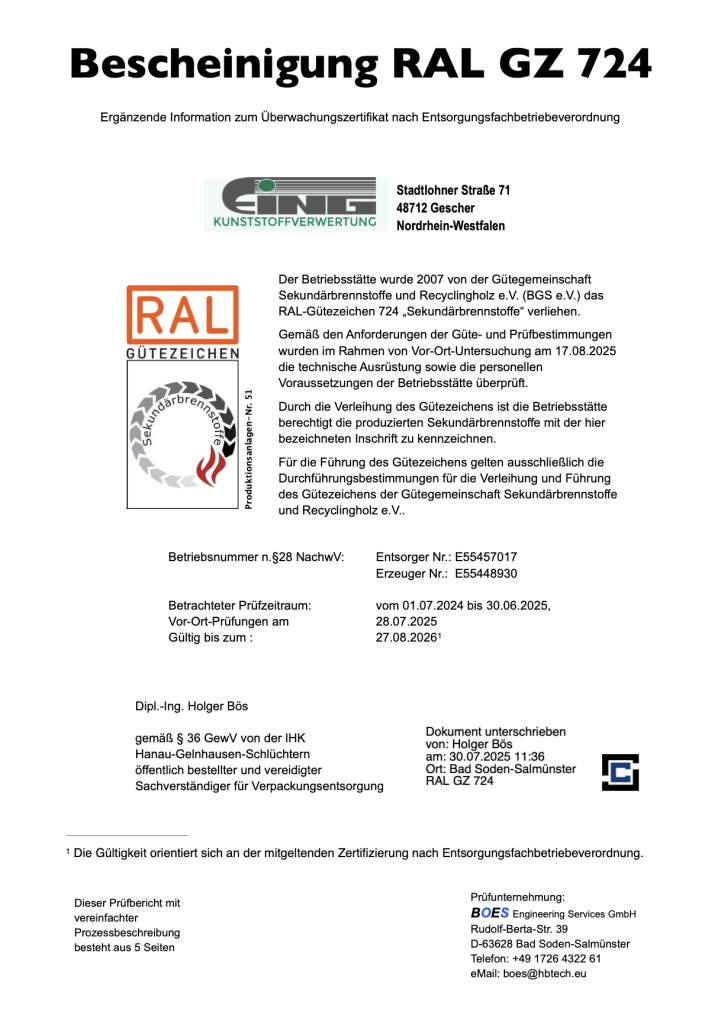 Das RAL-GZ 724 Qualitätssiegel legt Standards für umweltfreundliche Brennstofflösungen fest. Es definiert Qualitäts- und Sicherheitsstandards für Sekundärbrennstoffe, die aus Abfällen hergestellt werden und in industriellen Prozessen als Ersatz für traditionelle Brennstoffe dienen. Die Einhaltung dieser Standards gewährleistet eine umweltfreundliche und effiziente Nutzung der Brennstoffe unter Berücksichtigung der Anforderungen der Abfallbehandlungsgrundsätze (ABG). Durch die strikte Einhaltung dieser Kriterien fördern wir nachhaltige und verantwortungsbewusste Lösungen in der Kunststoffverwertung.